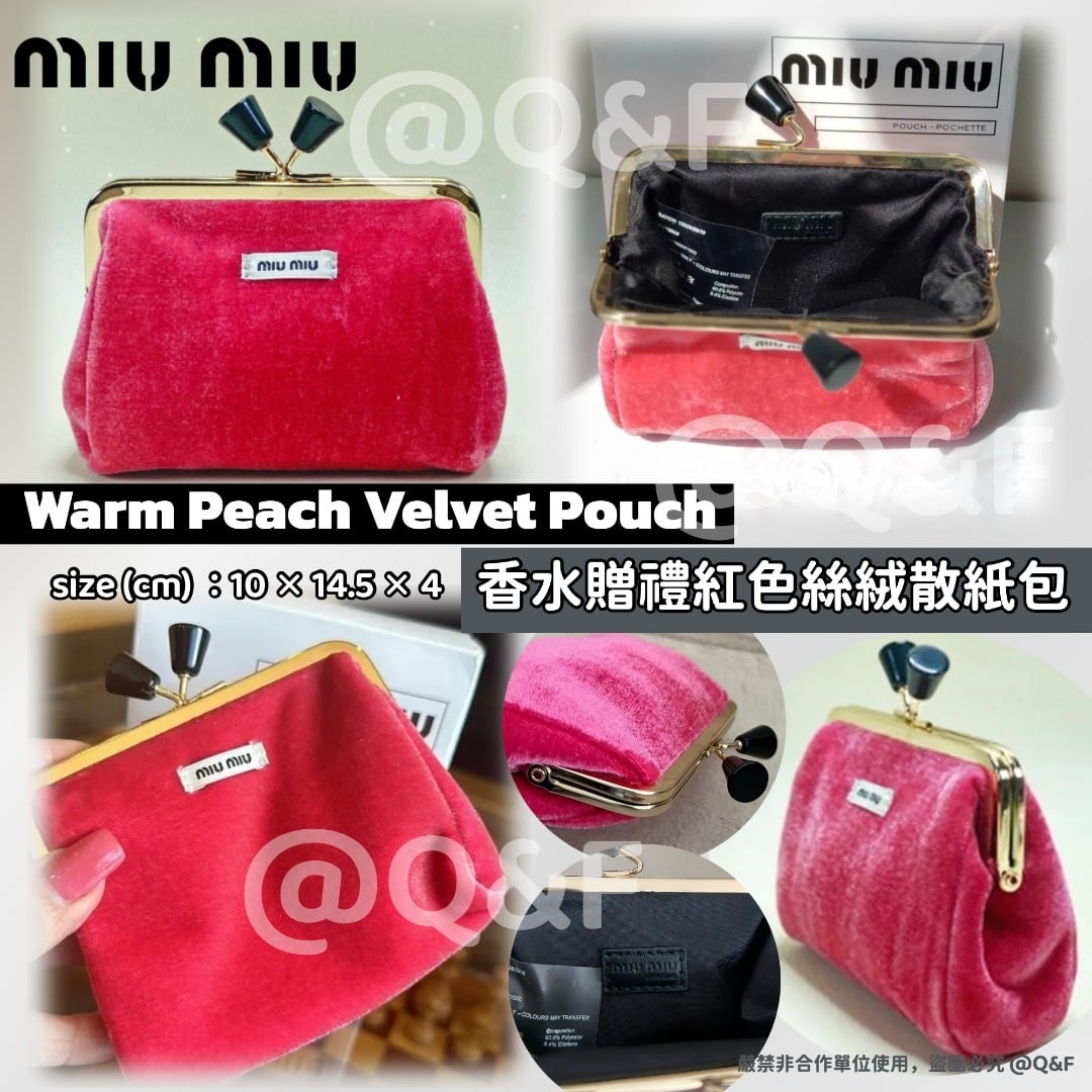 0121 Miu Miu Warm Peach Velvet Pouch 香水贈禮紅色絲絨散紙包 3月頭 截單日期:1月21日 到貨日期:預計3月頭 💲199 限量‼️尾貨‼️機場免稅店買香水贈品🎀 🍑Miu Miu Warm Peach 🍑 Velvet Pouch 高級絨毛面 布料為粉紅色拉絨絲絨 它可以用於多種用途,例如作為日常小袋、零錢包、卡包或錢包。 📐size (cm) :10 × 14.5 × 4 聲明: * 貨品為正品正貨 * 人手量度有機會1-3cm左右誤差屬正常 * 顏色可能會因網頁呈現與拍攝關係產生色差,圖片僅供參考,實物為準。