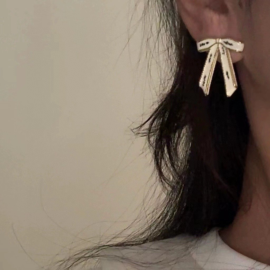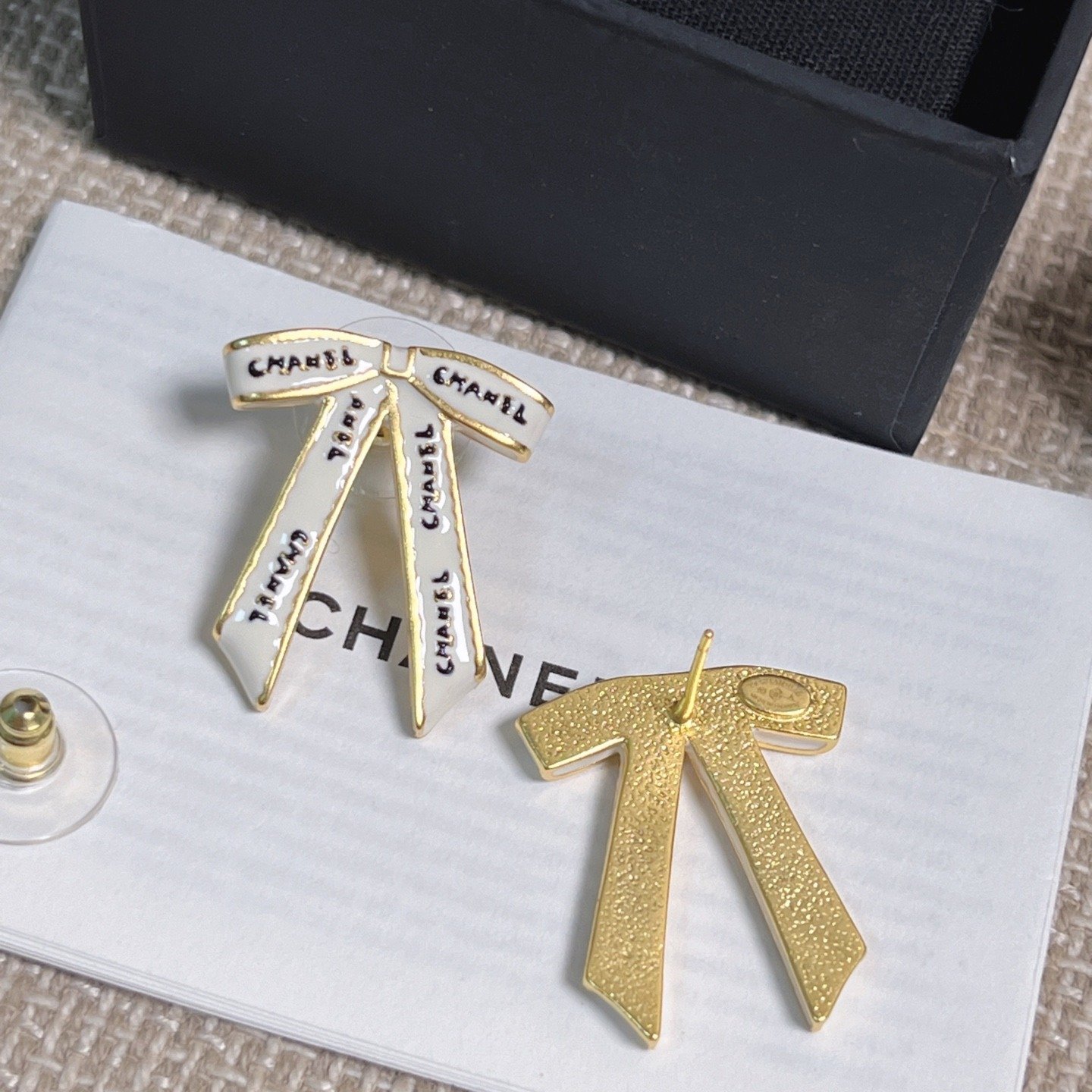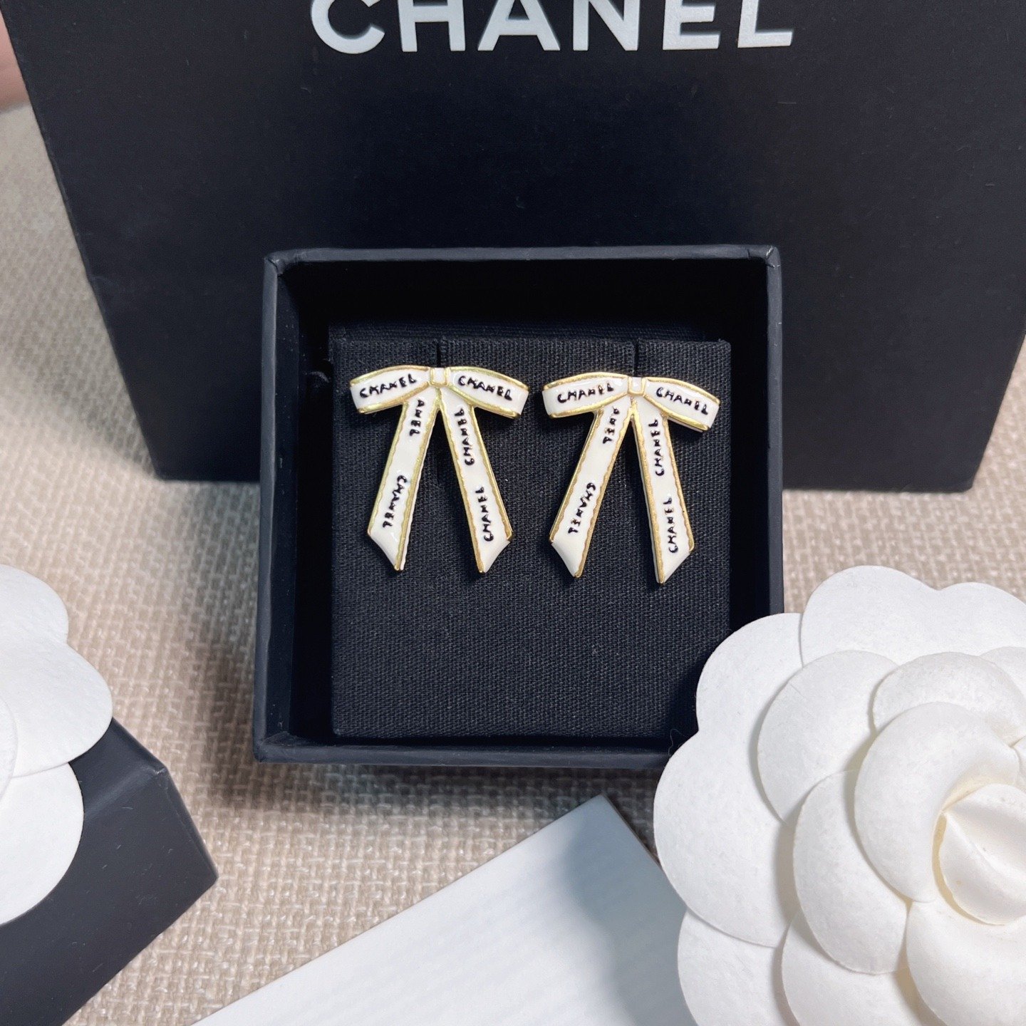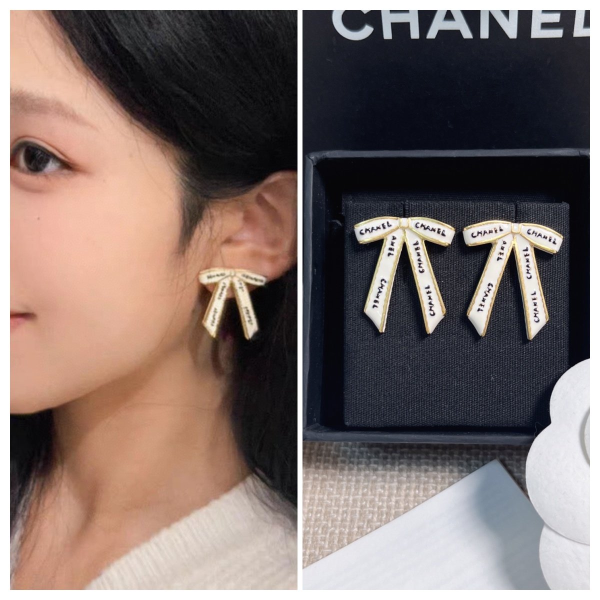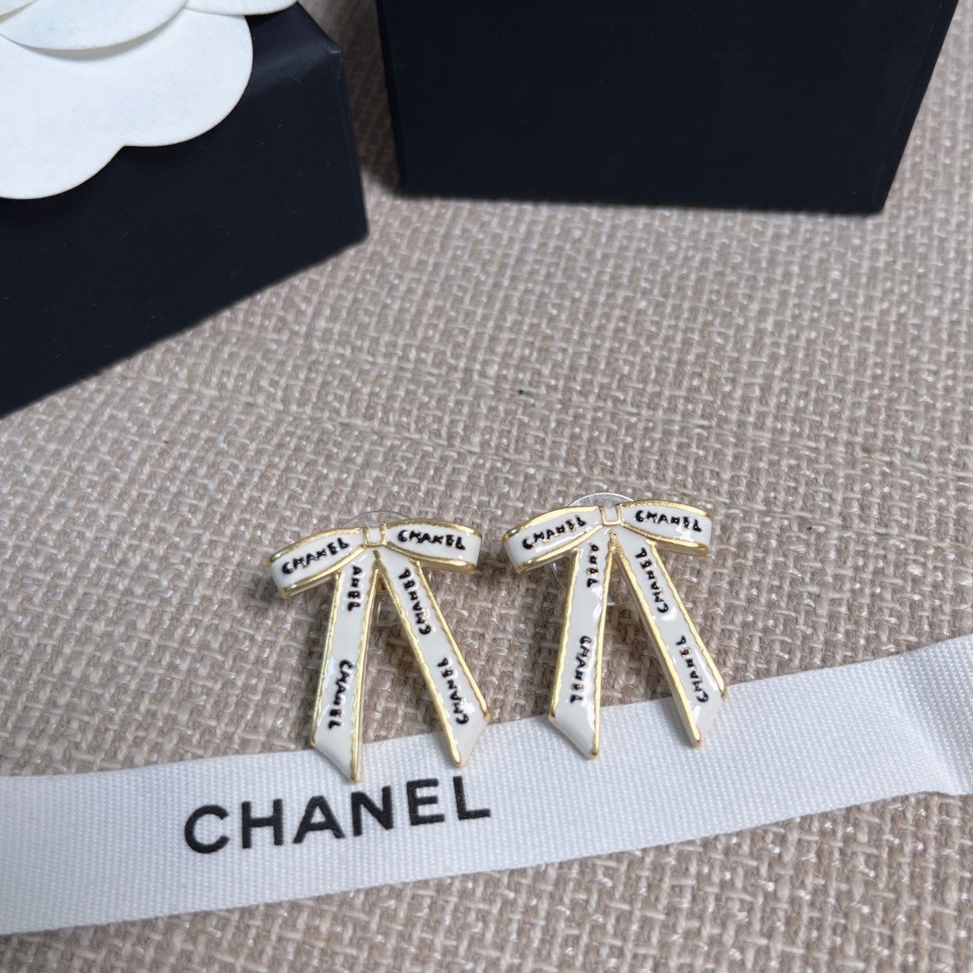 1020 Cha**nel 黑字母白絲帶蝴蝶結耳環 連禮盒⭕原單⭕12月尾
