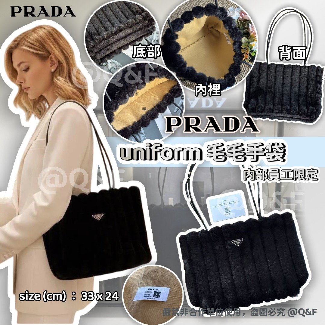 PRA**DA uniform 毛毛手袋💗內部員工限定 截單日期:11月25日 到貨日期:預計1月中 💲599 💯勁搶手 🙈not for sale 非賣品🙈💯正品 Pra**da內部員工限量訂購,售完即止!🥳 非常適合冬天使用的經典款手袋,優雅又易搭😍 ☁️ 毛絨材質展現出奢華感 😊 🎨 米黃色內襯,提升時尚感 🌟 🏷️ 經典三角logo點綴,增加辨識度 💖 👜 皮質肩帶與毛絨包身相結合,展現出簡約而有質感的風格 ✨ 🛍️ 配prada專門店紙袋,送禮一流👍 📐size (cm) : 33 x 24 💓少量,售完即止! 聲明: * 貨品為正品正貨 * 人手量度有機會1-3cm左右誤差屬正常 * 顏色可能會因網頁呈現與拍攝關係產生色差,圖片僅供參考,實物為準。